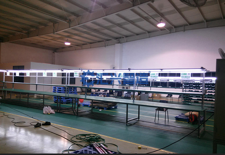 鏈板線采用A3板折制鏈板線專用軌道,而副導(dǎo)軌則采用角鐵制作。其中傳輸鏈條采用的是工業(yè)專用鏈板線鏈條;照明是采用單支帶罩T8LED日光燈,兩側(cè)連續(xù)安裝;工具吊軌采用專用風(fēng)批吊軌鋁材,兩側(cè)每米安裝一套風(fēng)批滑輪。此外,工藝看板采用專用雙杠H型鋁材做支架,每米配置一套亞克力板;采用6分鍍鋅制作而成的氣管和采用鍍鋅腳杯制作而成的地腳,共同為鏈板線的高效輸送保駕護航,能有力確保生產(chǎn)線的順利運行。