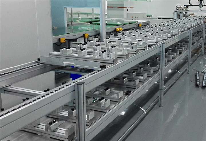 來料測試線機(jī)架腳架采用優(yōu)質(zhì)方通組焊制作,每2米一段,采用鍍鋅可調(diào)腳杯;線體皮帶護(hù)邊采用方管制作,沿線體兩側(cè)一路布置;承載采用鍍鋅滾筒,中心間距200㎜安裝一條,全線布置;輸送帶采用綠色PVC防靜電皮帶,厚2mm、寬500mm無縫熱縮接駁,皮帶面低于機(jī)身護(hù)邊8㎜;照明系統(tǒng):采用優(yōu)質(zhì)方管組焊制作,選用40W單支帶罩T8電子節(jié)能支架,全線布置。工作臺: 配對面坐工作臺,優(yōu)質(zhì)木夾板制作,面貼綠色防靜電膠皮,半圓木條包邊。