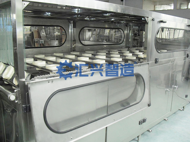 瓶子由撥輪旋轉送至沖瓶機構,瓶夾打開,夾住瓶口。瓶夾由導軌翻轉180°,使瓶口向下。將純水泵送至沖瓶機的分水盤,實現由下往上對瓶子內壁進行高壓沖洗,沖洗時間約為3-5s。沖洗結束后,再逆時針旋轉180°,將瓶子放下,由旋轉撥輪過度到灌裝部分。