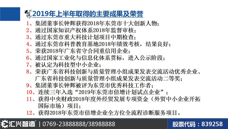 大會第五項議程知識產權部經理蔣明華“年上半年取得的主要成果匯報”。實力見證榮耀,品質鑄就輝煌。公司始終牢記“做受尊敬的好人、造受尊敬的產品、辦受尊敬的企業、建受尊敬的平臺”的企業使命,砥礪奮進,載譽而歸。這些榮譽既是對匯興智造年上半年成就的肯定,又是對未來發展的勉勵!
