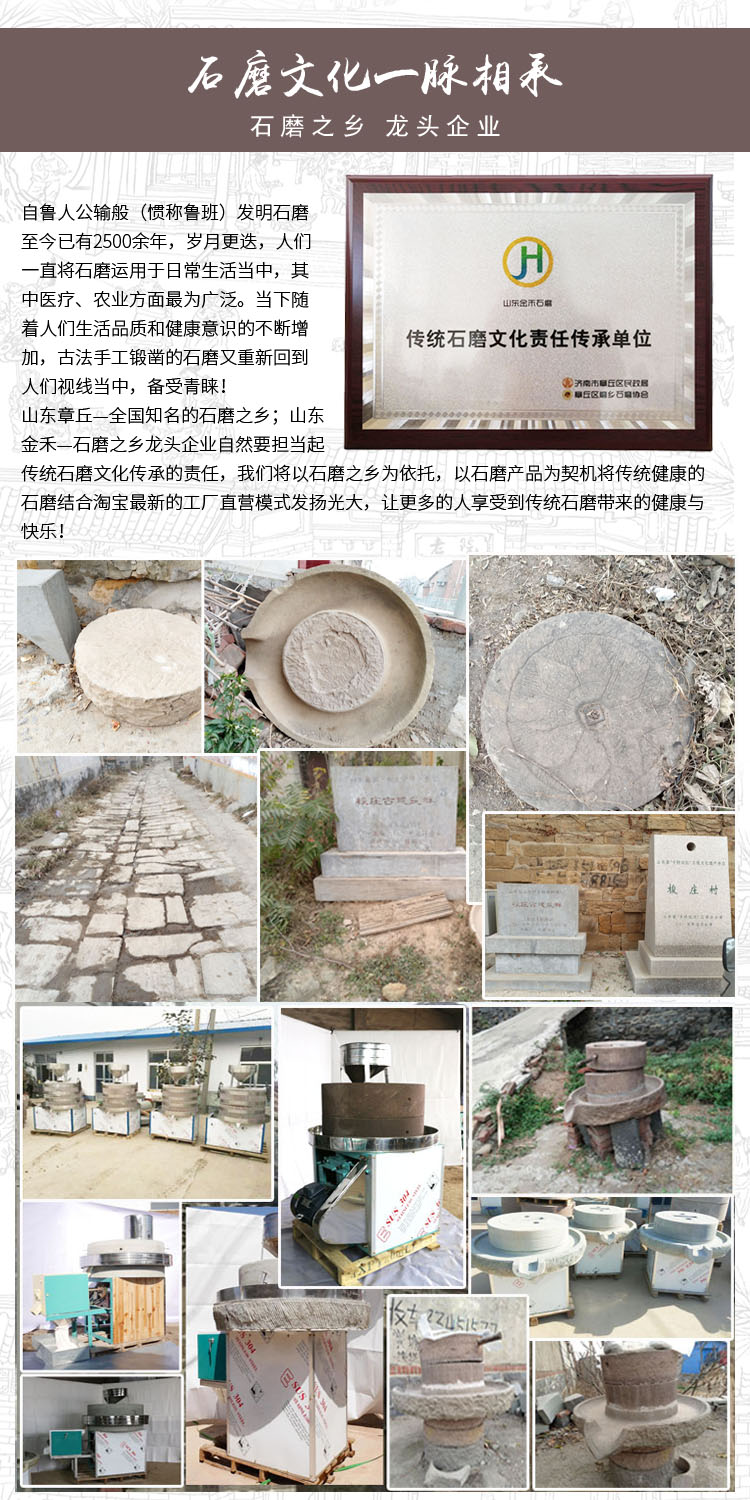山東金禾動力技術有限公司位于李清照故里,素有“石磨之鄉”、“小泉城”之稱的山東章丘,北有濟青高速,西鄰濟南國際機場,側臥膠濟鐵路,交通位置得天獨厚。金禾石磨是全國知名的集研發、生產、銷售、服務一體化的石磨生產企業。 金禾石磨自改革開放以來已創立三十余年,一直致力于石磨機械的研發與生產,被譽為全國石磨機械研發基地。現主要產品有電動石磨面粉機、石磨豆漿機、香油石磨、米漿石磨、雜糧面粉石磨、石碾、全自動石磨、石碾設備等,產品種類齊全,操作簡單,廣泛適用于各類食品企業、糧食加工企業、食堂、食品加工廠、餐館等