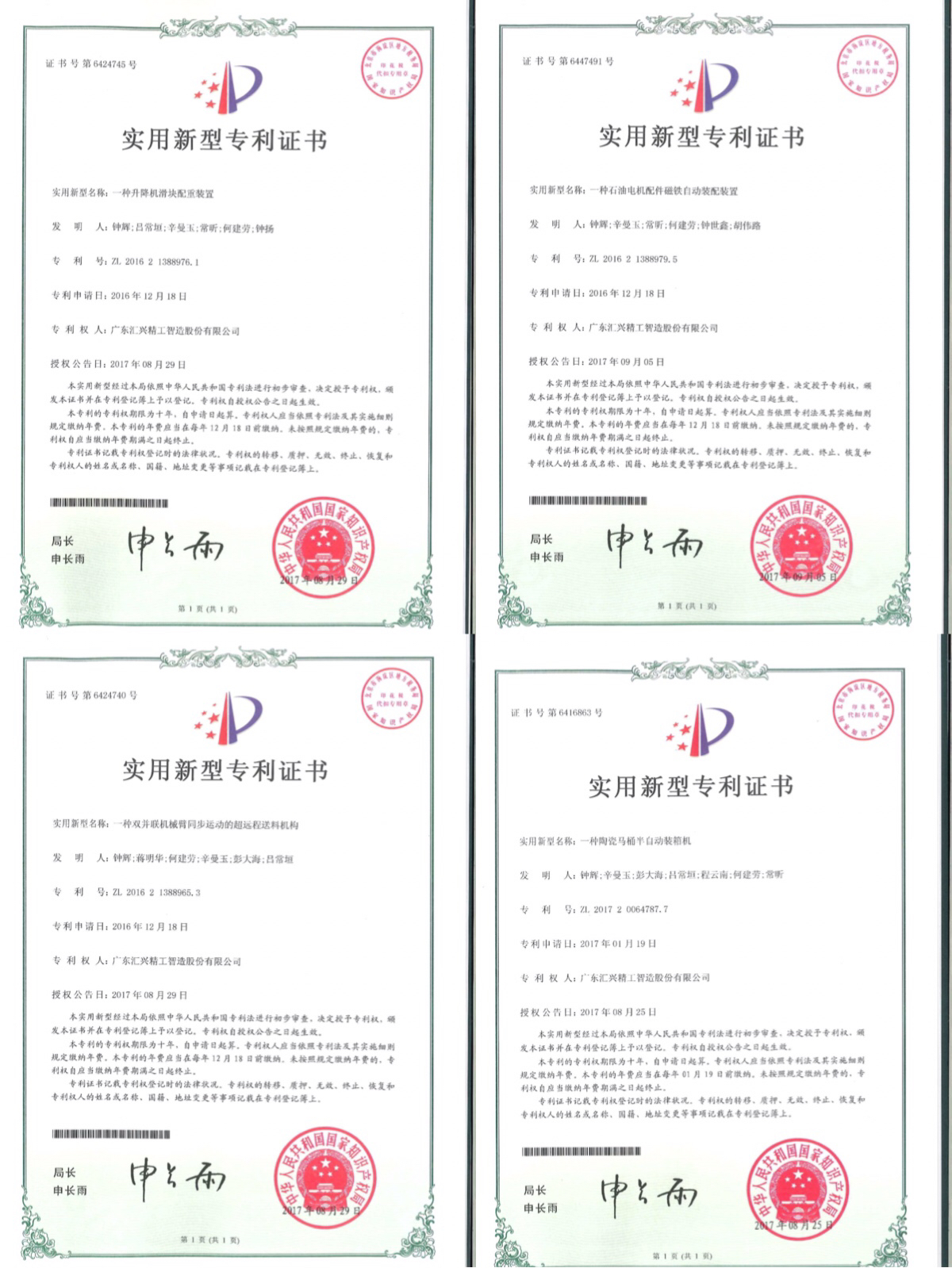 2017年9月25日,廣東匯興精工智造股份有限公司(股票代碼:839258)又獲得四項實用新型專利授權。關于一種升降滑......